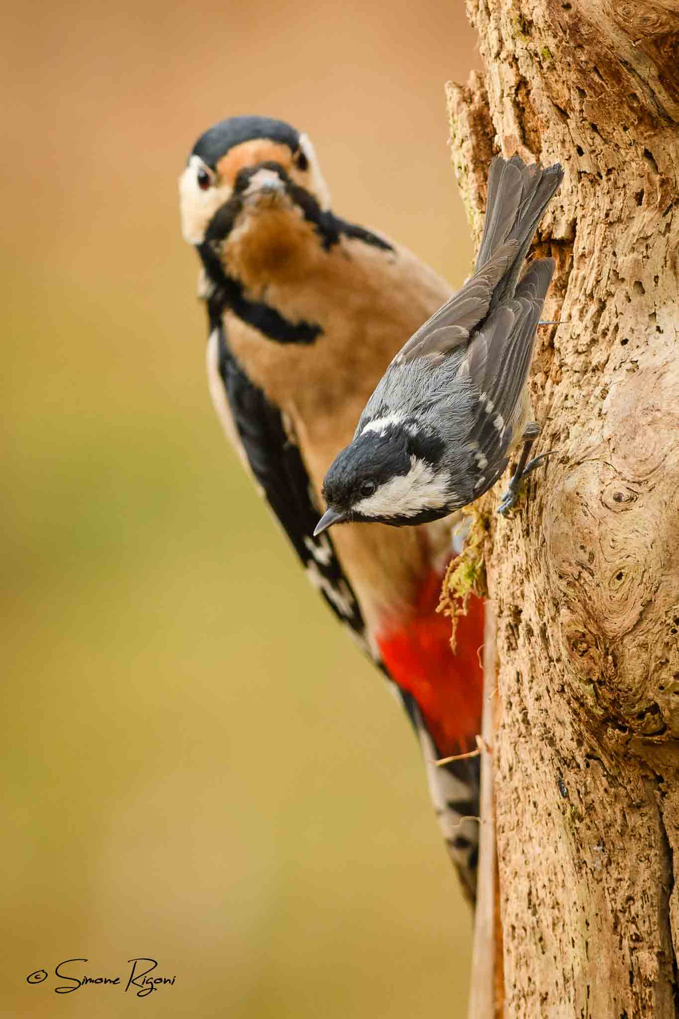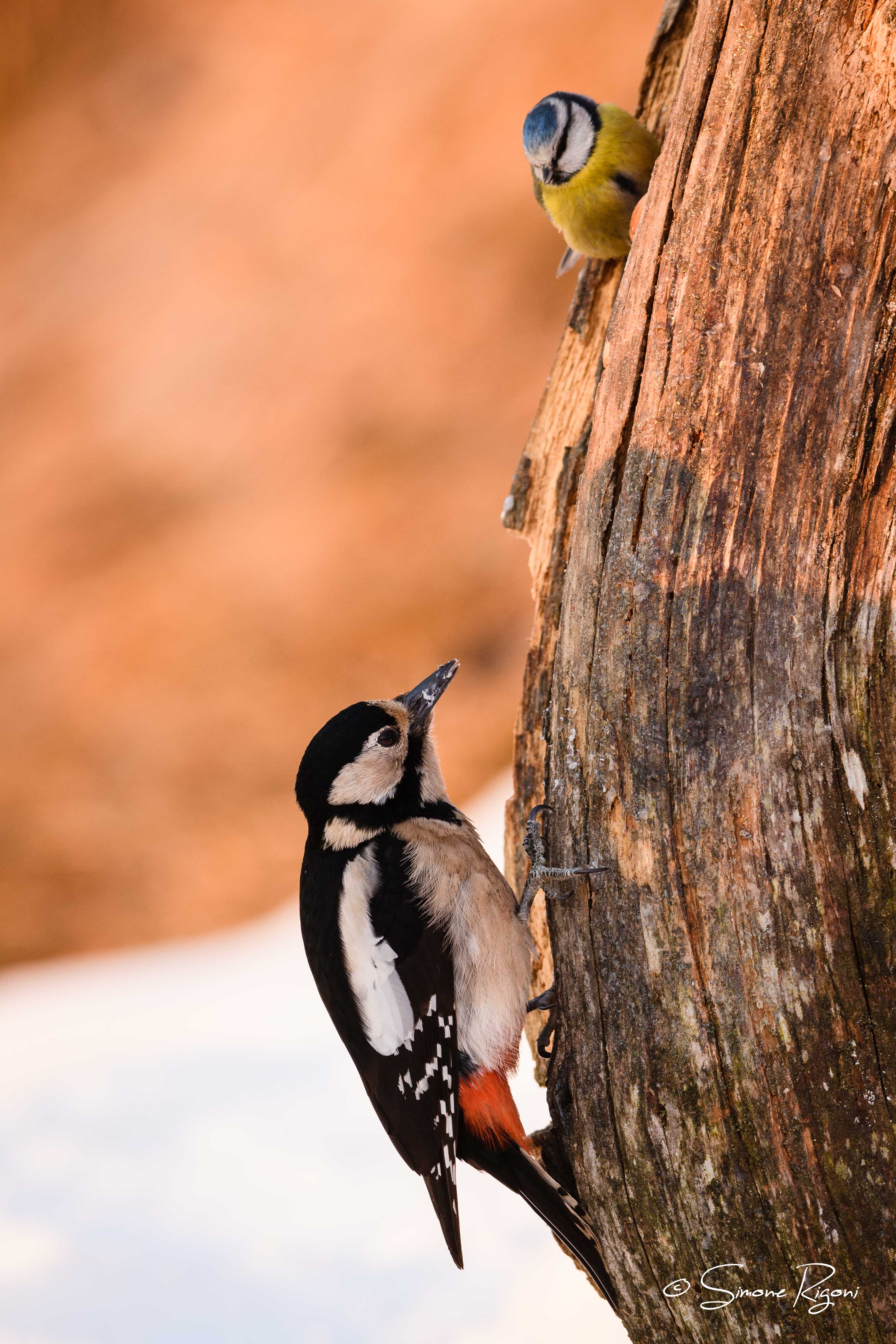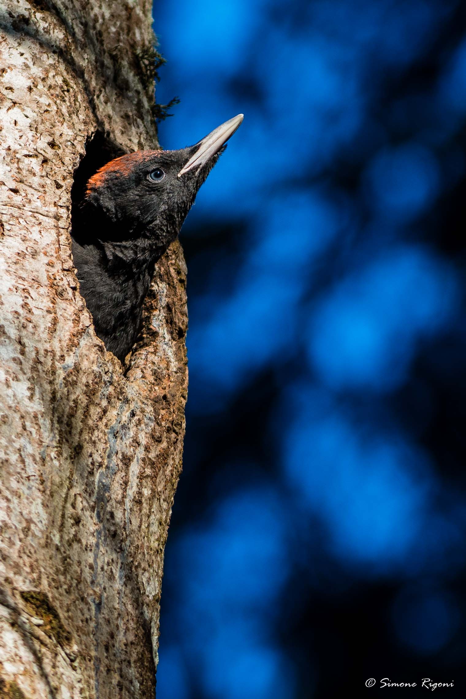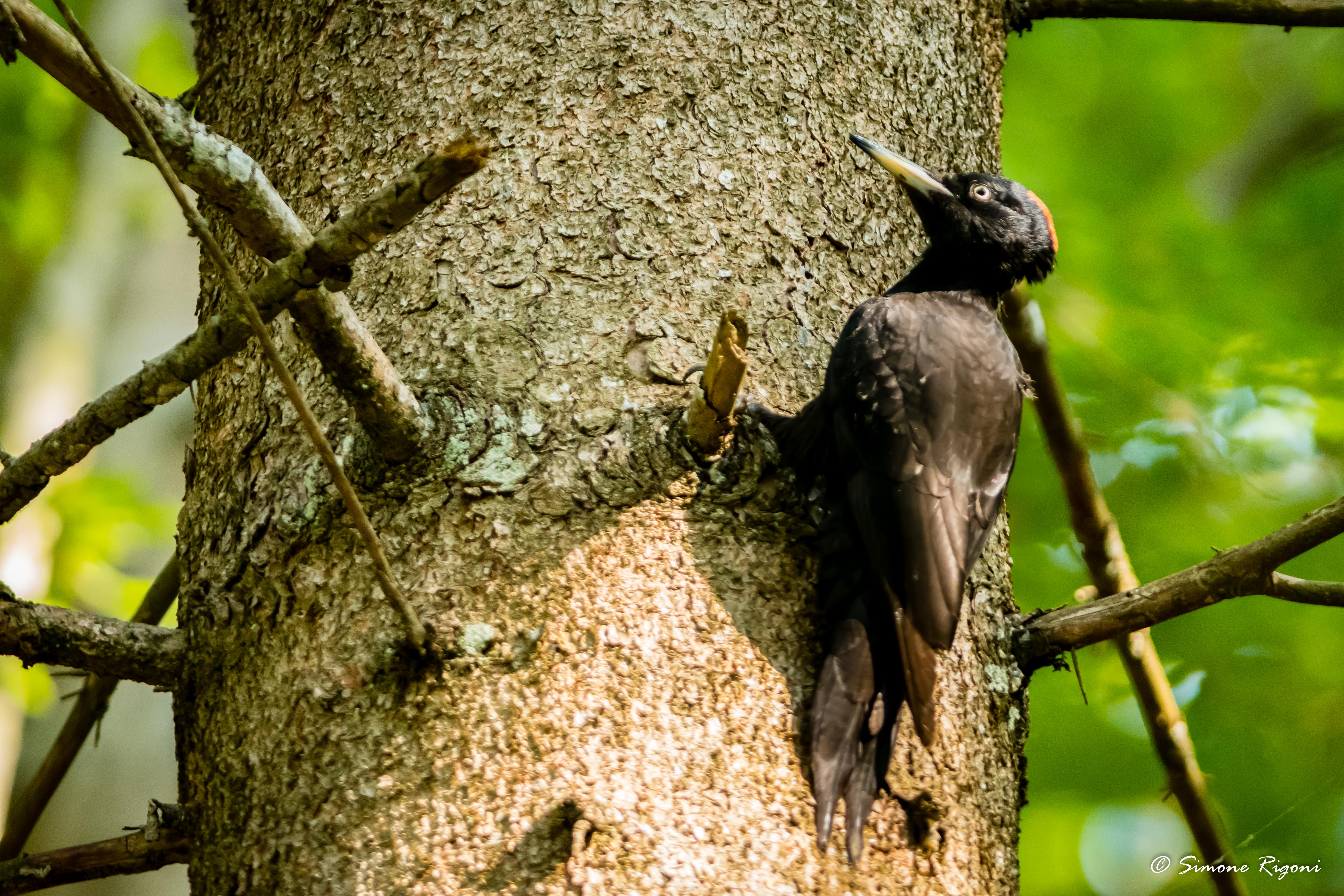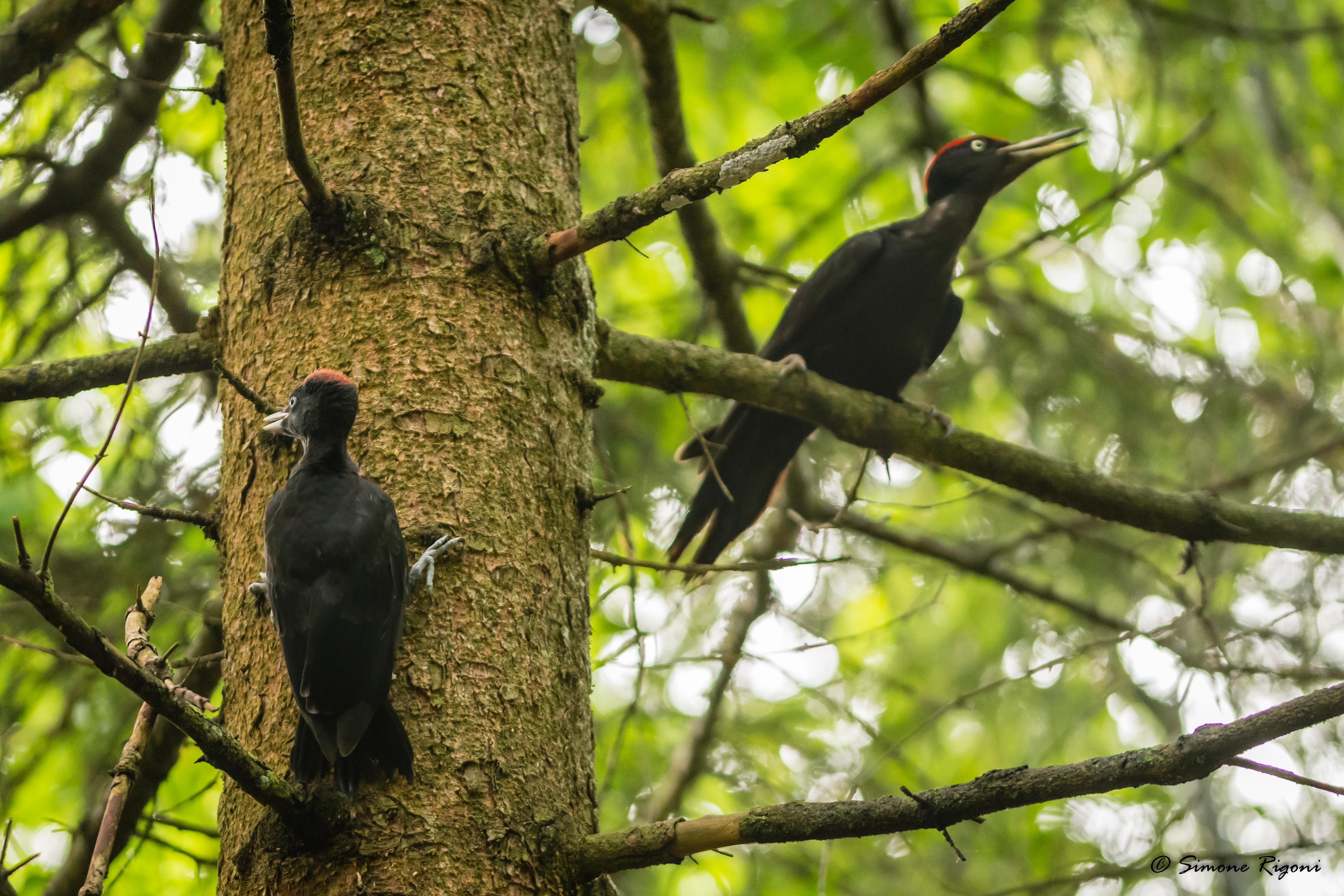 Giovane di picchio nero appena uscito dal nido, controllato dal padre