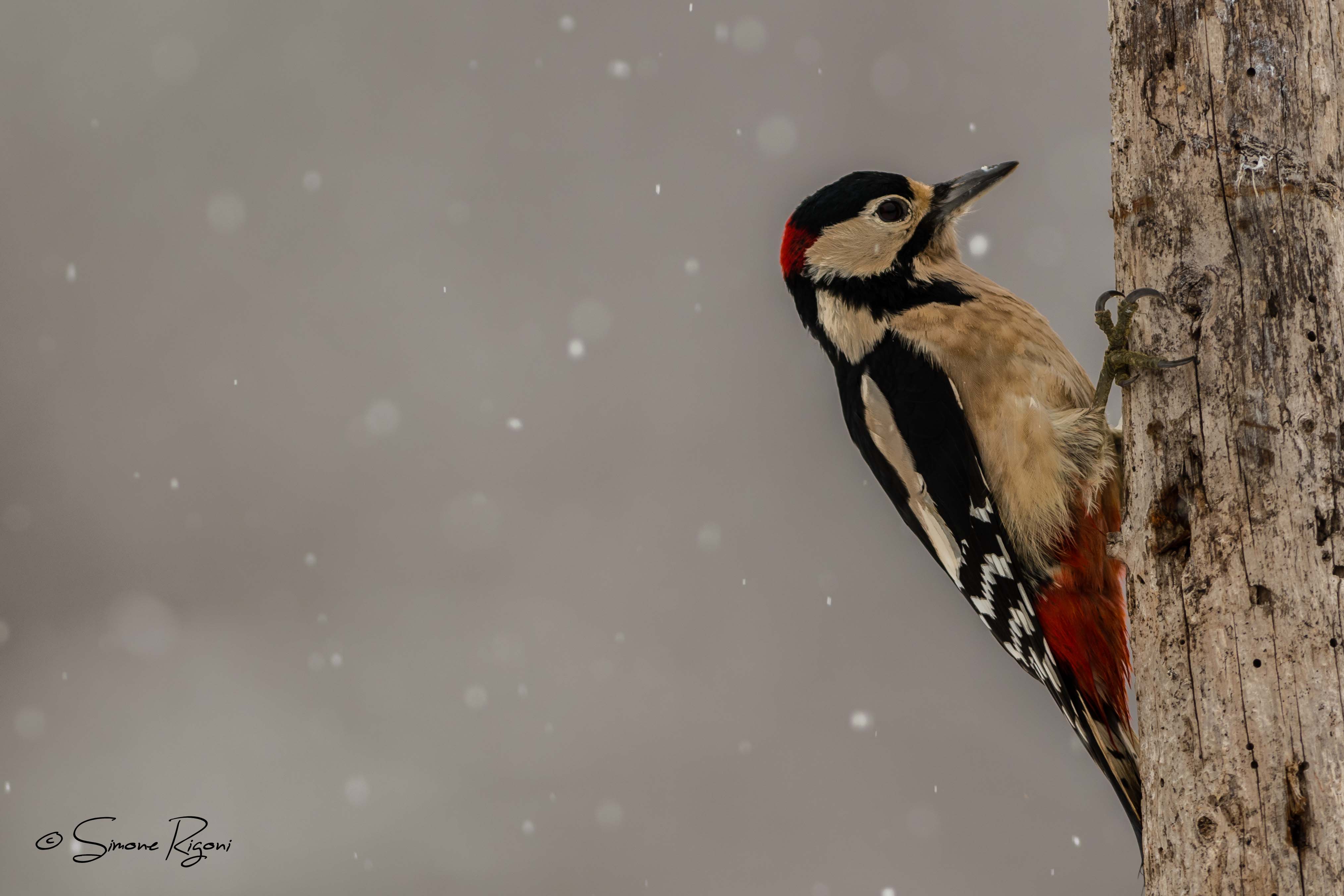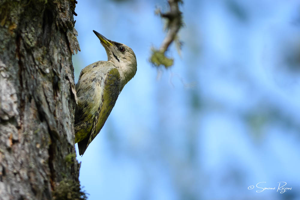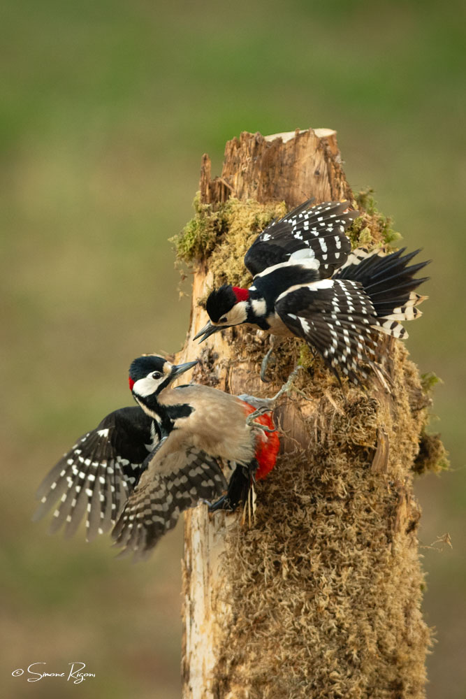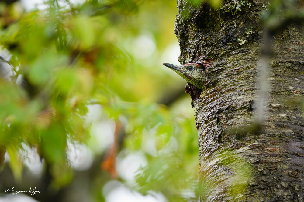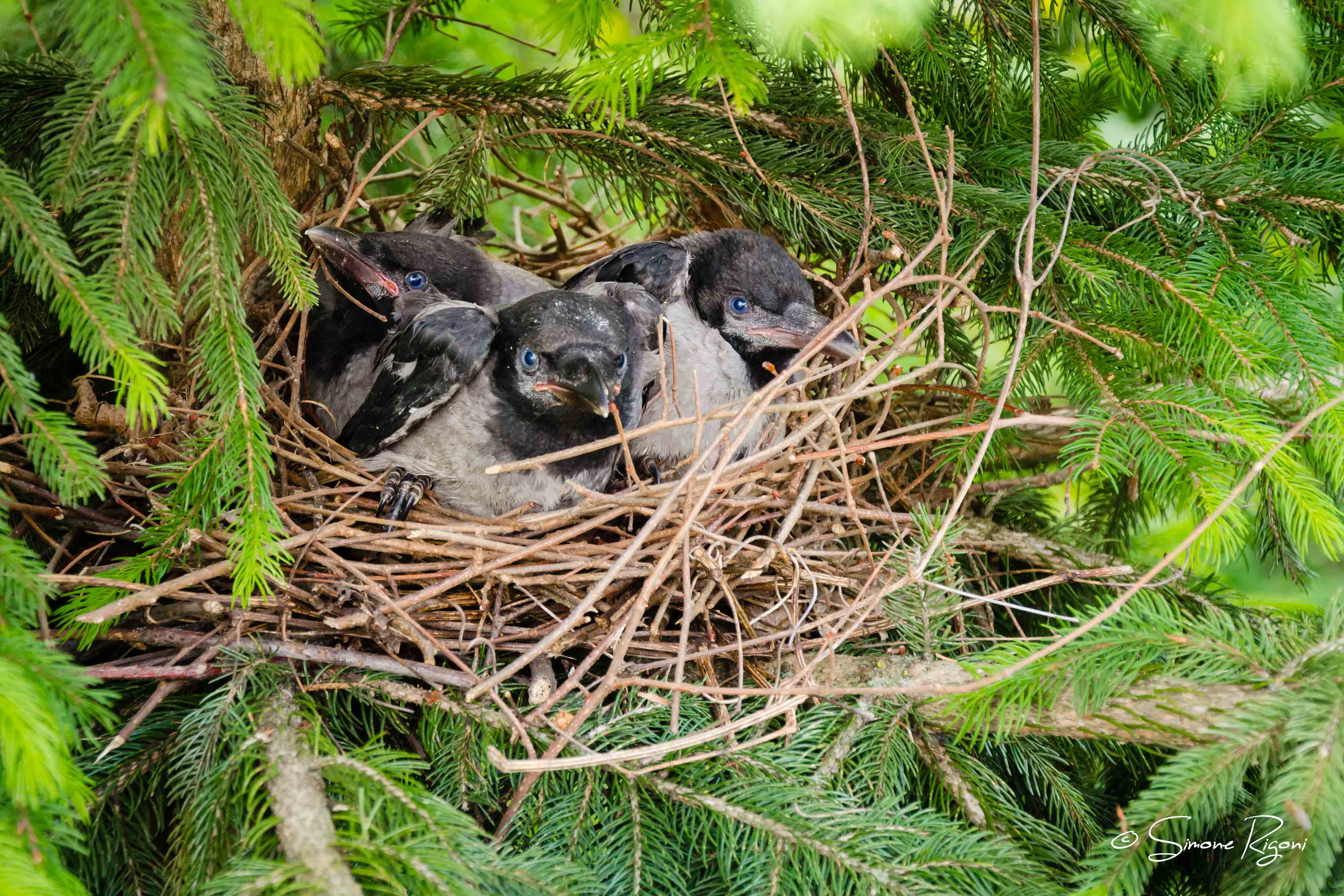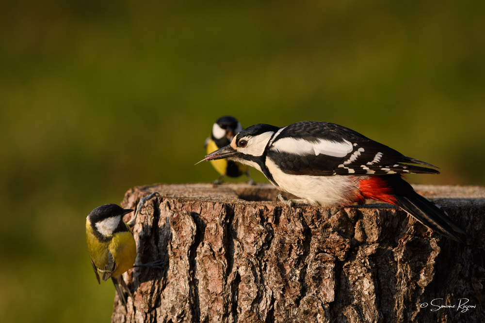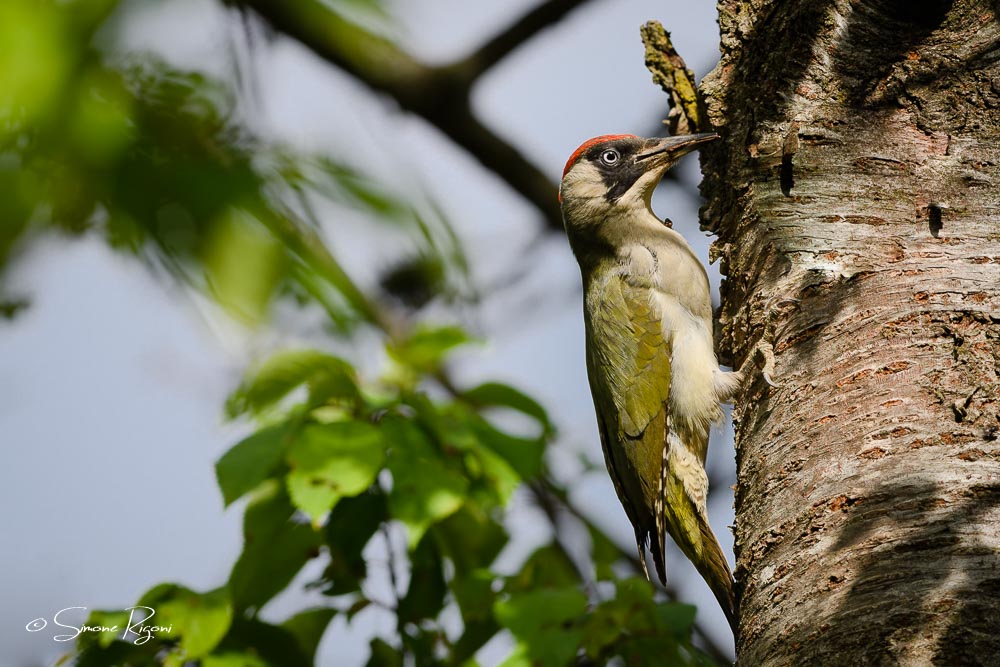 Giovane di picchio nero appena uscito dal nido, controllato dal padre