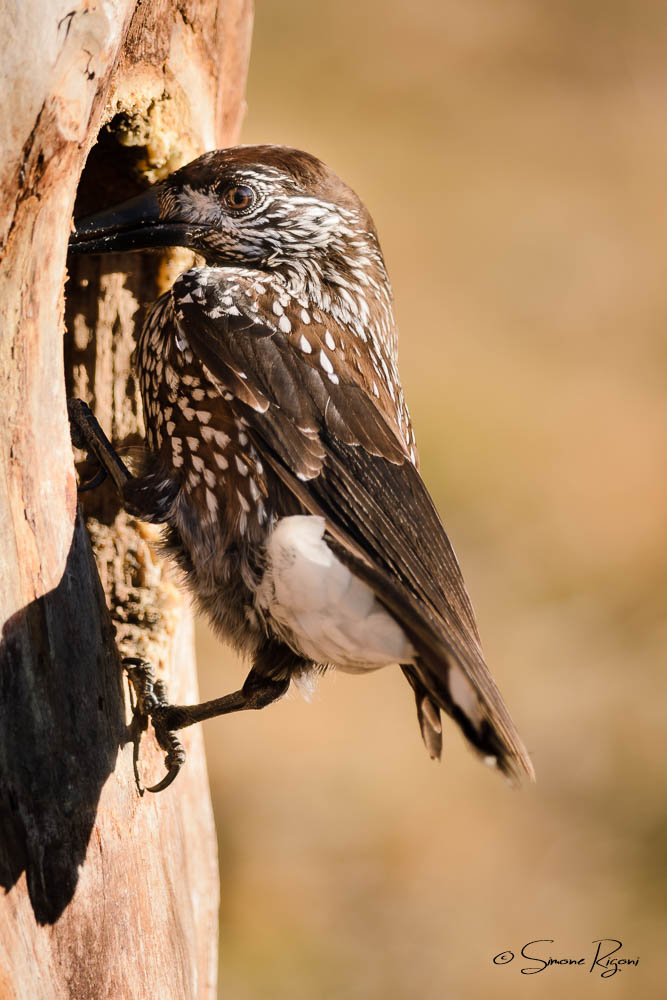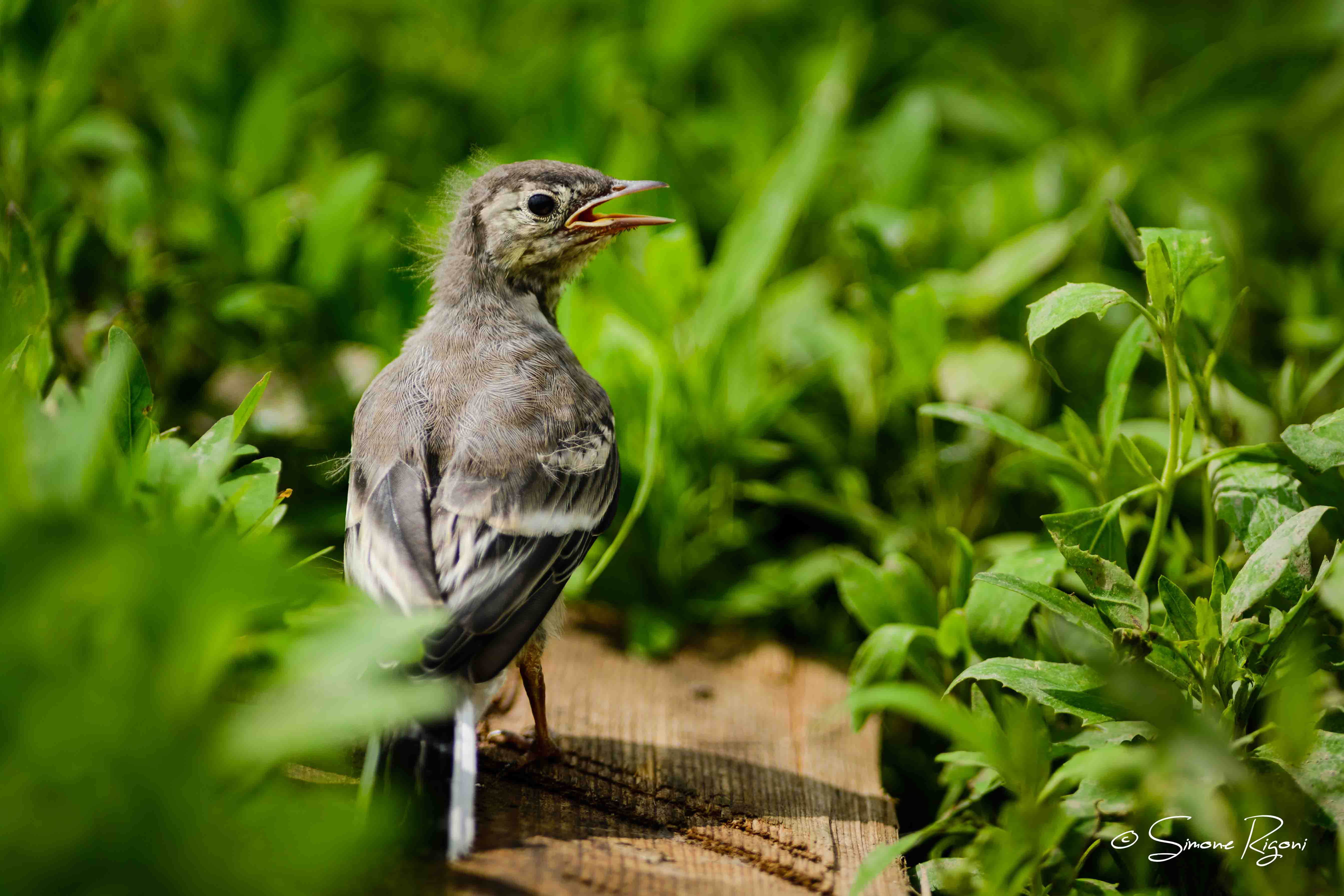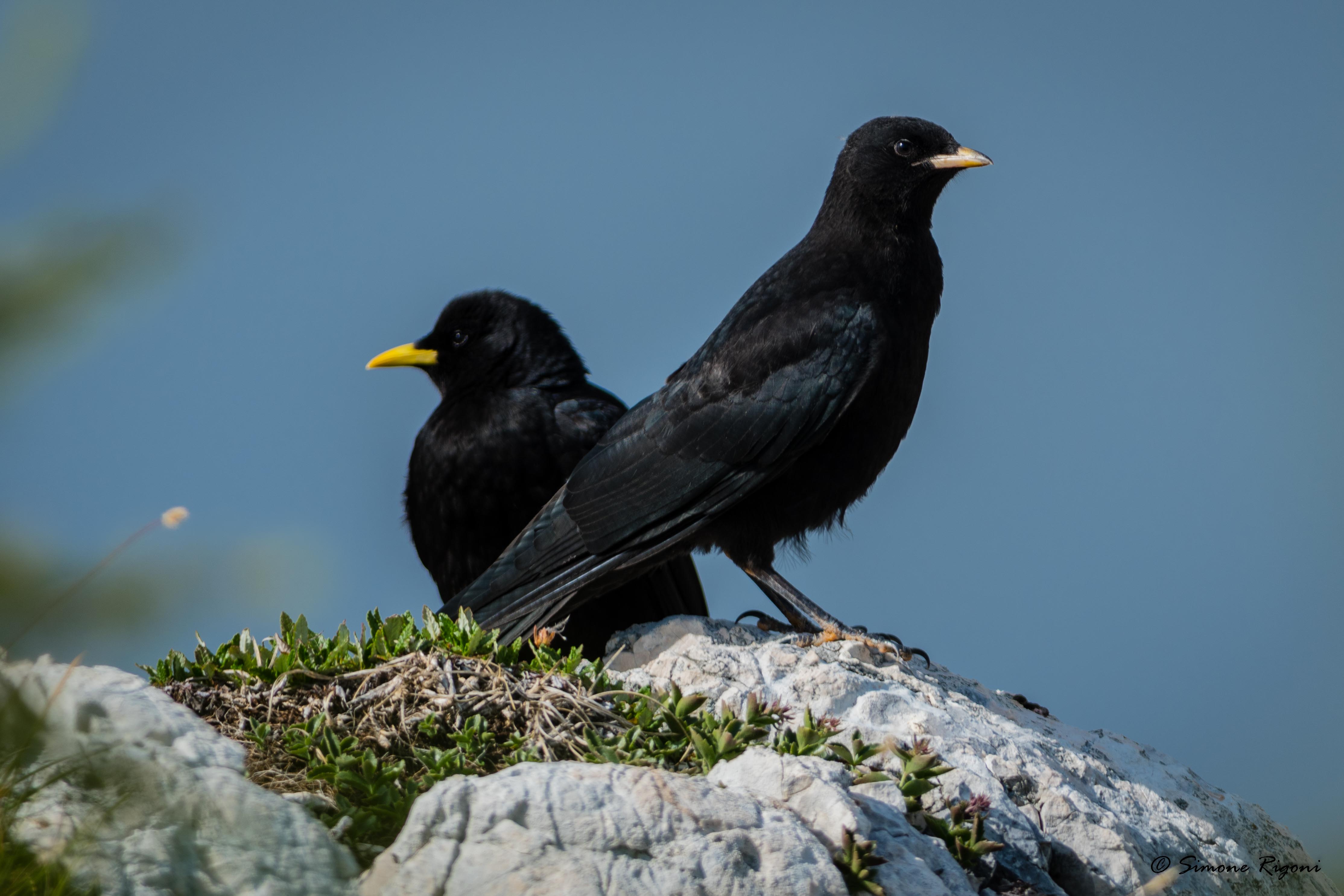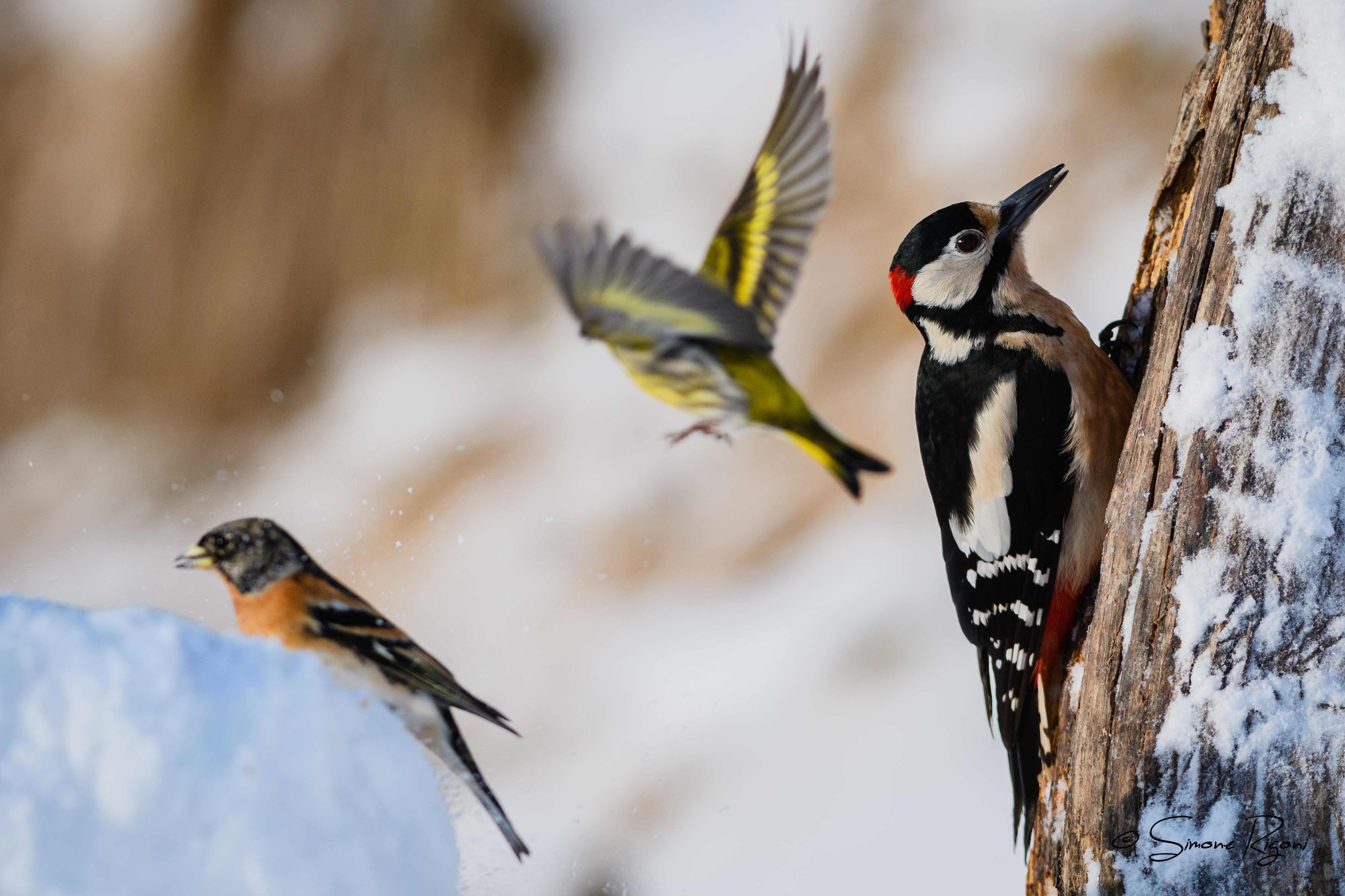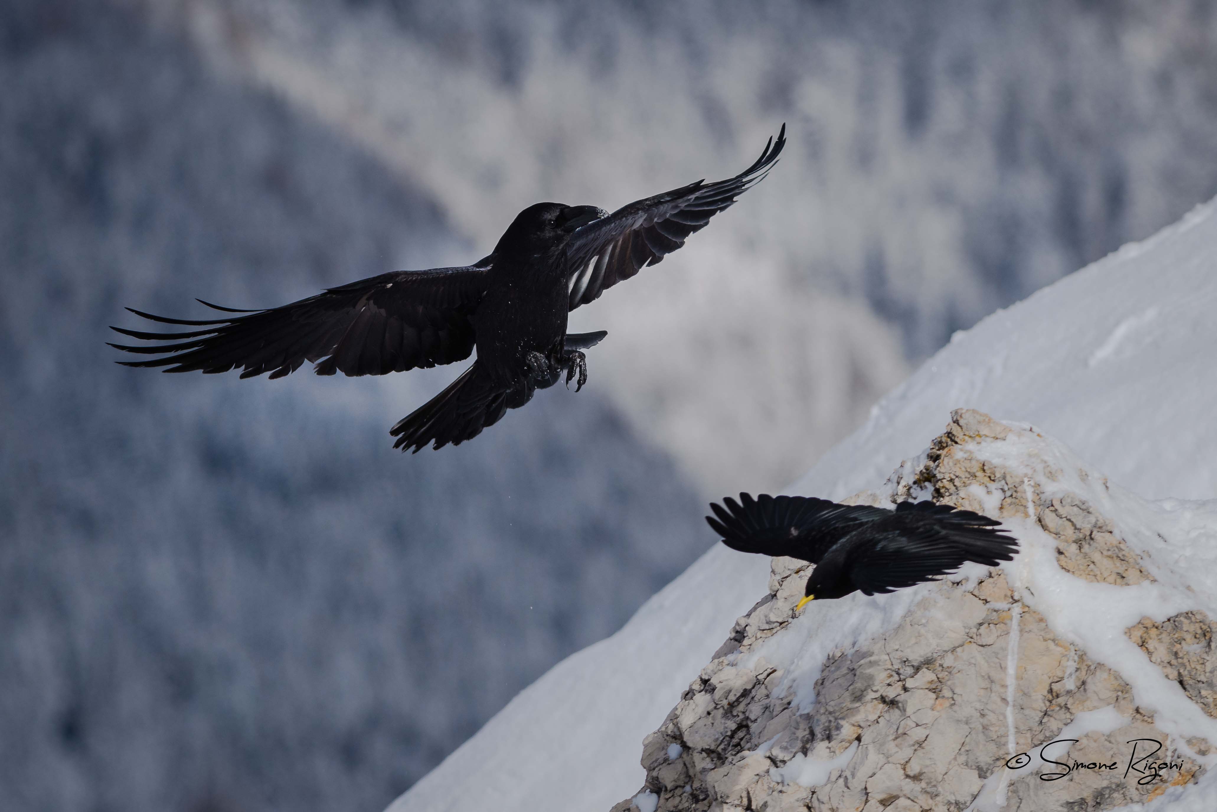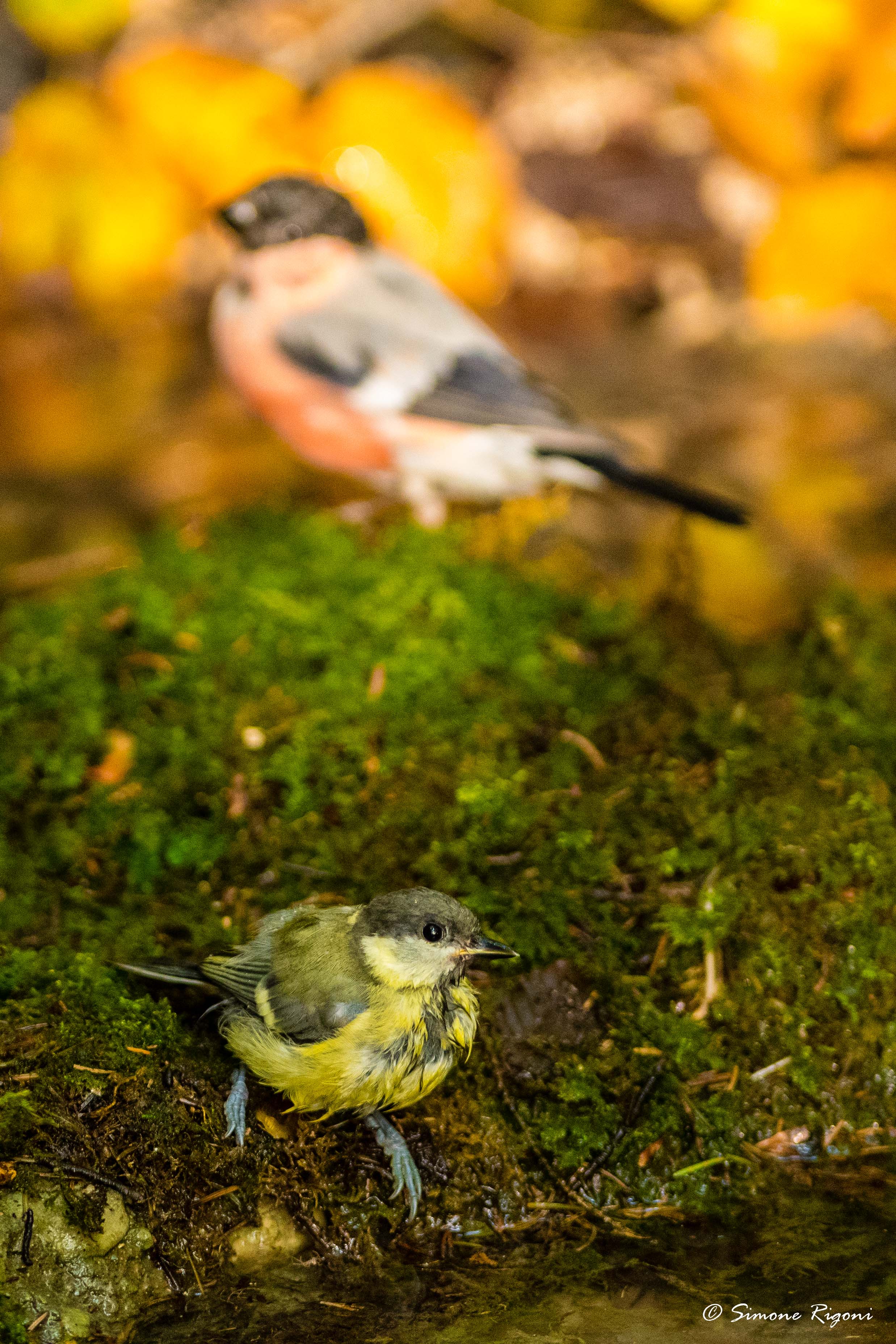 Giovane di picchio nero appena uscito dal nido, controllato dal padre